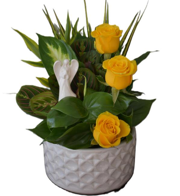 Lush foliage garden presented in glazed pottery offered in 8" and 10" diameter. These are appropriate as an everyday gift or a sympathy remembrance. This design can be upgraded with cut flowers and/or an angel accessory. Please specify upgrade choice in Special Instruction section of order form.