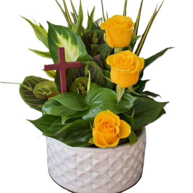 Lush foliage garden presented in glazed pottery offered in 8" and 10" diameter. Note: Pottery will vary in color and pattern. These are appropriate as an everyday gift or a sympathy remembrance. This design can be upgraded with cut flowers and/or a cross accessory. Please specify upgrade choice in Special Instruction section of order form.