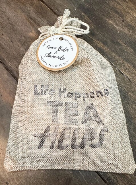 When you can't be there to share a proper cuppa or spill the tea in person, send this - and flowers! This darling bag from Herbal Rose Apothecary contains everything needed to brew comforting cups of tea: 2 varieties of loose-leaf tea, honey stick, and tea ball infuser. Bag is suitable for reuse.