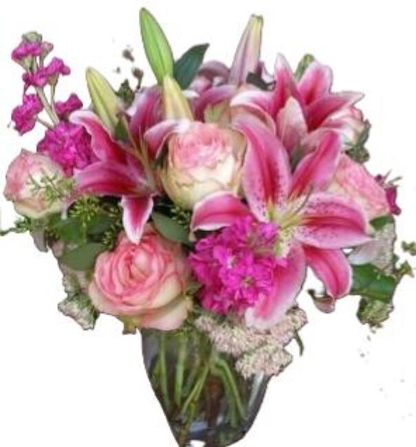 A design of roses, lilies, stock and supporting flora in shades of pink presented in a low contemporary style. Approx. 12" in diameter. Floral selection may vary based upon market & seasonal availability.