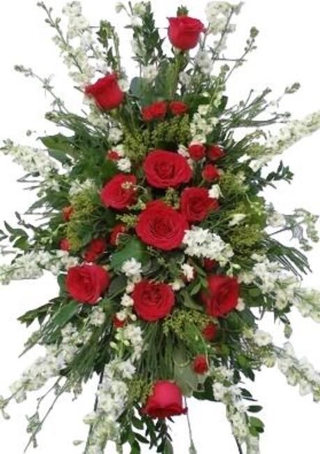 Floral spray featuring a two-color scheme and lush foliage. Note: Start Design substitutes carnations for roses. Please specify color scheme when ordering or phone us at 609-654-8338 to confirm colors. Note: If an item is unavailable, we will substitute an item of equal or greater value.